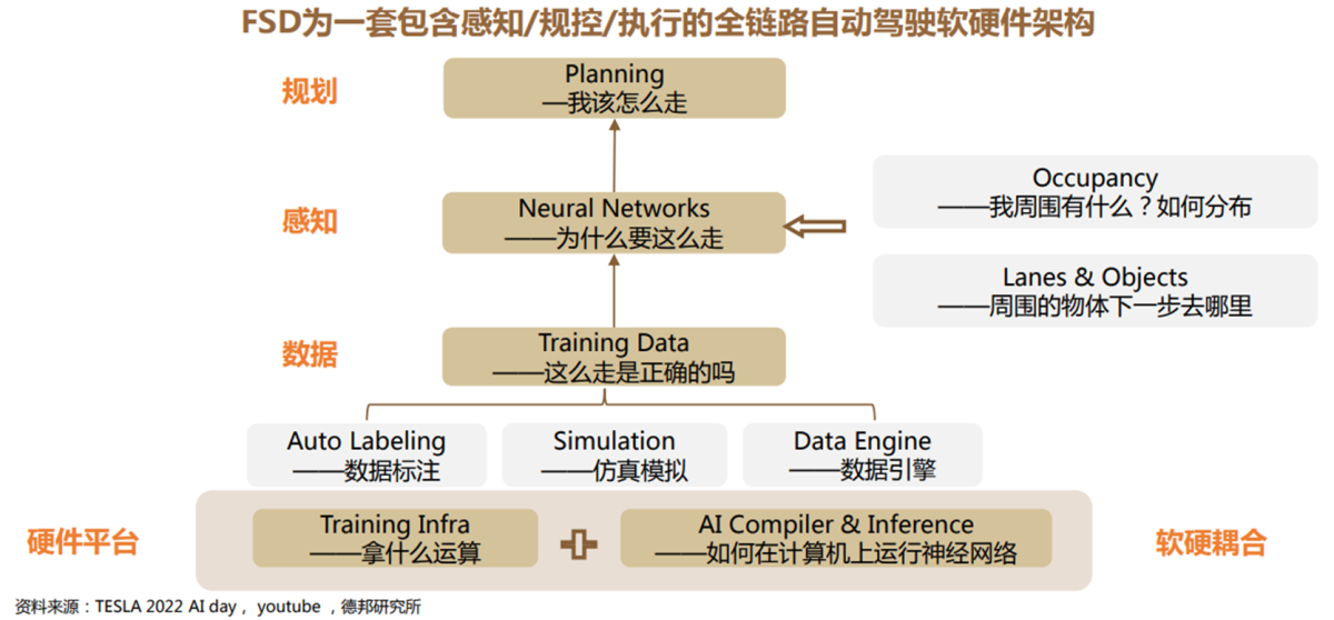 从架构上来说,FSD在数据、算法、算力等各个层面,打造了一套包含感知、规控、执行在内的全链路自动驾驶软硬件架构。