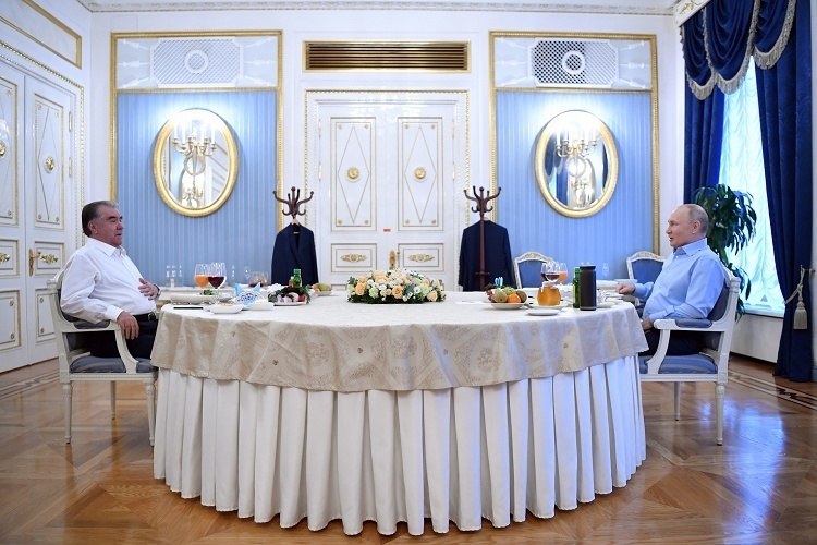 俄罗斯总统 Vladimir Putin 与塔吉克斯坦总统 Emomali Rahmon 在工作早餐会上交谈,莫斯科。11月21日,塔吉克斯坦总统 Rahmon 应邀对俄罗斯进行为期2天正式访问。两国领导人就双边关系、经贸、能源、矿产合作、地区及国际局势议题交换意见并签署8项合作文件。Putin 表示俄方有意与塔方进行铀、锂和稀土矿产的联合勘探与开发。俄罗斯是塔吉克斯坦的第一大经贸伙伴,2022年两国贸易额约15亿美元,目前两国83%贸易使用卢布结算。摄影师:Alexander Kazakov