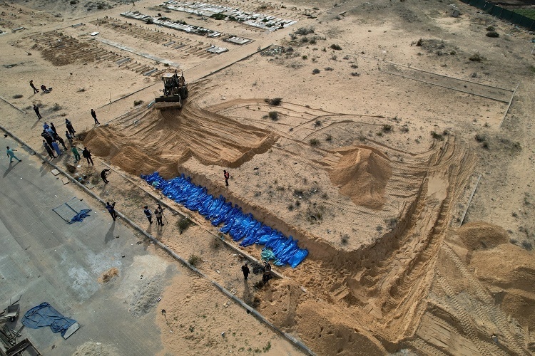 以色列空袭中遇难的巴勒斯坦人遗体被埋葬在集体墓坑中,汗尤尼斯。11月22日,以色列与哈马斯宣布在卡塔尔等国的斡旋下达成为期4天的临时停火协议,哈马斯组织将释放50名被扣押的以色列妇女和儿童,以换取以色列释放150名巴勒斯坦妇女和儿童。中国、美国、英国、埃及、俄罗斯、土耳其、阿拉伯联盟、联合国均对停火协议表示欢迎,联合国秘书长表示将动员一切力量支持停火协议落实。以色列本轮袭击已造成加沙地带14532人死亡,包括至少6000名儿童,超过170万人流离失所。摄影师:Mohammad Fayq
