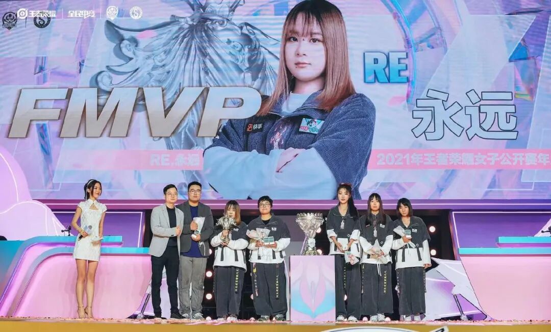 在经历了北京、武汉、上海、成都四站分站赛,以及年度决赛后, RE-Girls在12月11日击败了强劲的对手FIRE,最终捧起了2021年王者荣耀女子公开赛年度总冠军的奖杯,RE-Girls对抗路选手周增(ID:永远)也斩获了女子公开赛的首个FMVP。