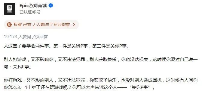 Epic官方表示:别人打游戏只要没影响我,关我P事?我打游戏只要没影响别人,关你P事?目前该回答获得了1.9万用户的赞同,有人表示:说得好!别人想玩就玩,碍你啥事了?