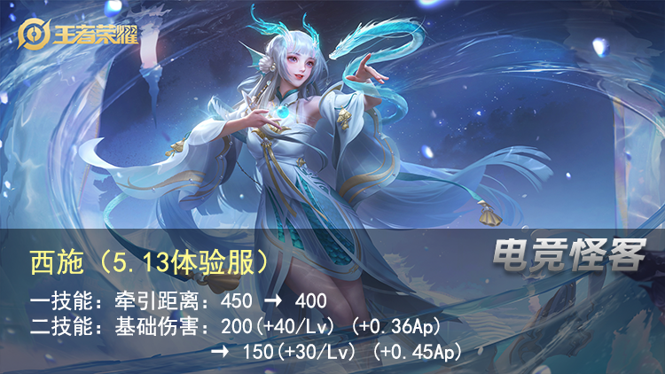 牵引距离下调50点,二技能基础伤害和等级伤害加成降低,提高了ap伤害加成。 简单来说就是本来就是工具人法师的西施,前期更加没伤害了。而牵引距离的下降,也让西施在拉人的时候更危险。