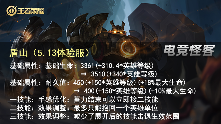 目前盾山全分段的ban率为 69.3% ,仅次于东皇。所以策划这一次在体验服里大幅削弱了盾山的二技能,改为了【 最多只能抱回一个英雄单位 】,这样盾山 开团的威胁大大降低 。并且三技能展开后的技能击退的生效范围,也减少了。 而且被动的耐久值也较大幅度下降,可以说盾山这次是全方位削弱 。