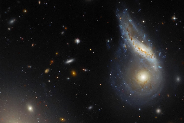 NASA 公布一张哈勃太空望远镜拍摄的武仙座「Arp 122」星系团照片,画面右侧的两个螺旋星系「NGC 6040」和「LEDA 59642」正在发生碰撞融合。这2个星系距离地球约5.7亿光年,最终可能合并形成一个新的椭圆星系。星系碰撞是一种常见的天体现象,天文学家预测地球所在的银河系将在大约40亿年后与仙女座星系发生碰撞。摄影师:NASA