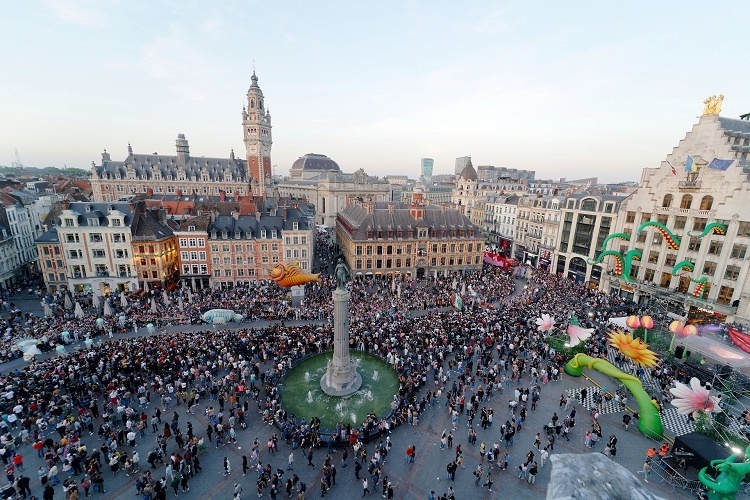 法国里尔市举办「乌托邦」主题文化节,民众在戴高乐广场观看露天表演。本届里尔文化节从5月14日持续至10月2日,计划举办145场展览、音乐会、讲座等主题活动,预计吸引超过30万游客。法国国家统计局数据显示2022年4月消费者物价指数(CPI)同比增长达5.4%,创下历史新高。通胀飙升和俄乌局势导致法国消费者信心指数下降,第一季度 GDP 环比增速为0%,低于市场预期,其中家庭支出环比下跌1.3%。摄影师:Sylvain Lefevre