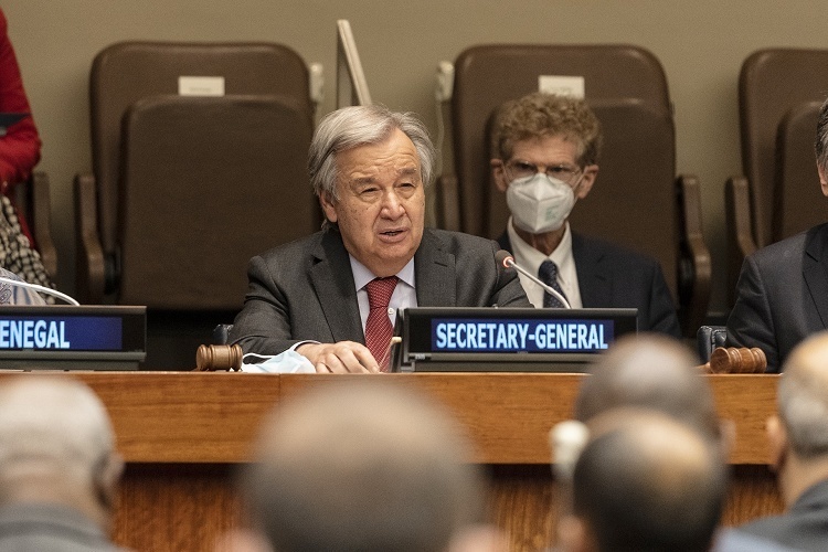 联合国秘书长 Antonio Guterres 出席全球粮食安全问题会议,纽约。5月18日,联合国发布报告下调2022年全球经济预测增长至3.1%,比1月预测值大幅减少0.9个百分点,负面因素包括俄乌冲突、能源和大宗商品价格上涨、主要经济体增长放缓等。报告预测美国2022年经济增长2.6%,主要受高通胀压力和货币紧缩政策影响;预测中国2022年经济增速为4.5%,主要受新冠疫情清零政策影响;预测欧盟2022年经济增速为2.7%,主要受俄乌冲突影响。摄影师:Lev Radin