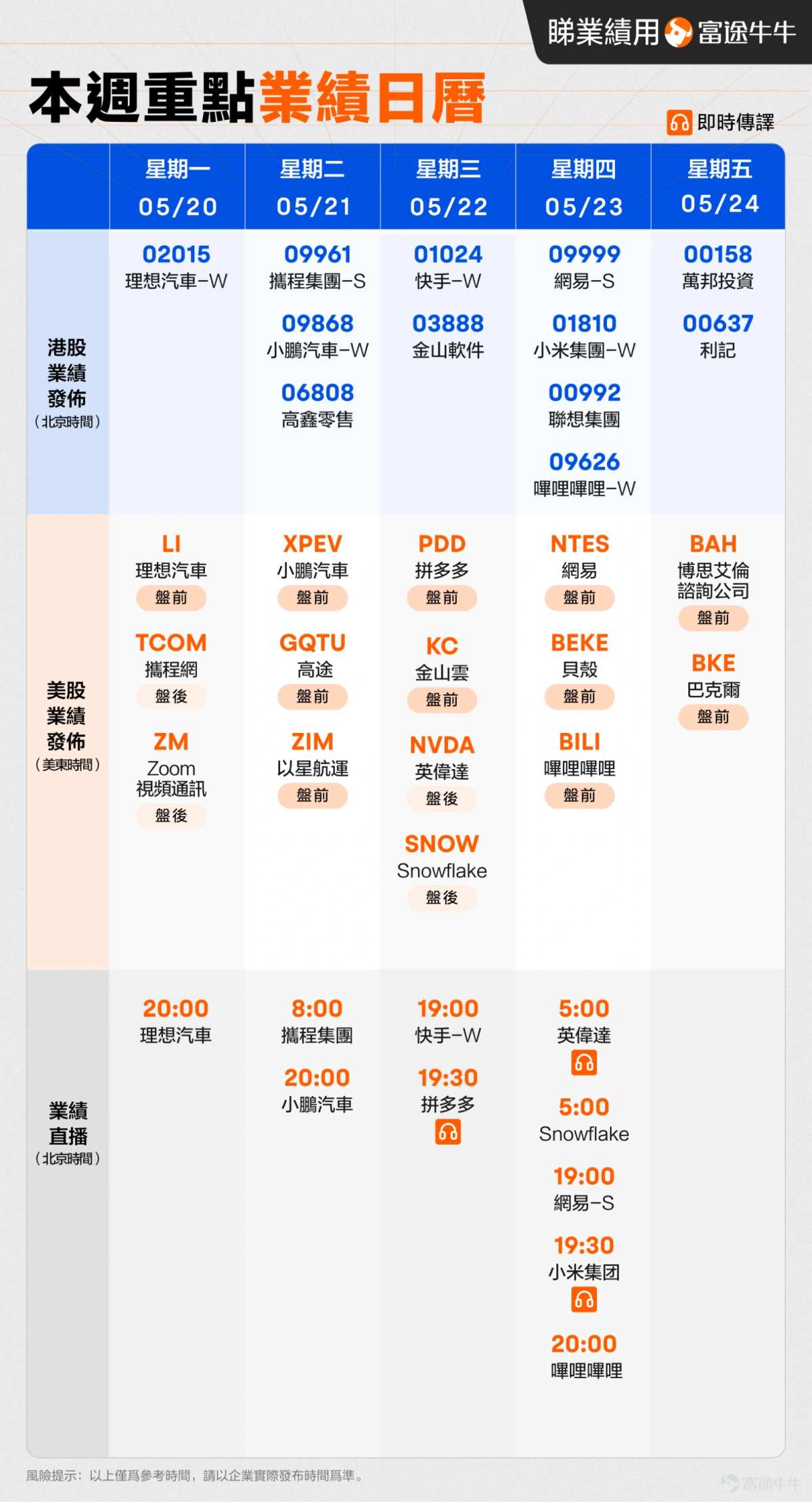 多家热门中概股公司也将发布业绩,包括拼多多、理想汽车、小鹏汽车、网易、B站等。港股方面,快手、小米集团、联想集团等公司也将于本周公布财报。