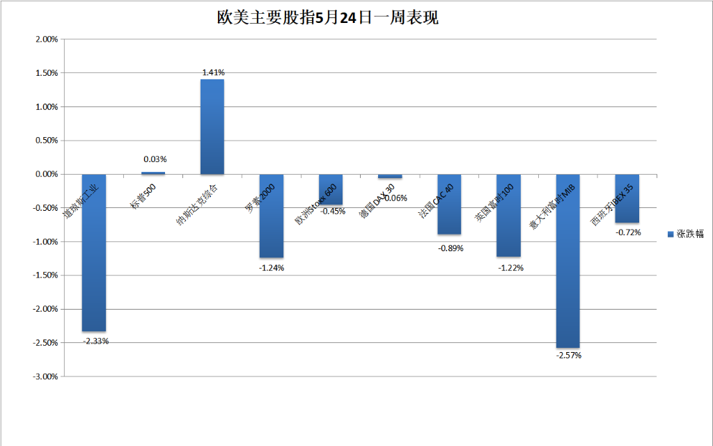 本周主要美股指多数累涨。标普微涨0.03%,纳指和纳斯达克100累涨1.41%,均连涨五周,而道指累跌2.33%,创去年3月以来最大周跌幅,终结连涨五周,连涨四周的罗素2000累跌1.24%。