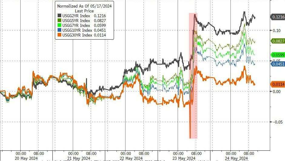 对利率前景更敏感的2年期美债收益率在欧股早盘曾下破4.92%刷新日低,美股盘前曾连续第二日盘中升破4.95%,连续两日刷新5月2日以来高位,消费者通胀公布后,美股早盘曾下破4.94%、抹平升幅日内微降,后很快重上4.94%,午盘曾升破4.95%逼近日高,到债市尾盘时约为4.95%,日内升逾1个基点,连升三日,在上周回落后本周累计升约13个基点,创六周内最大升幅。