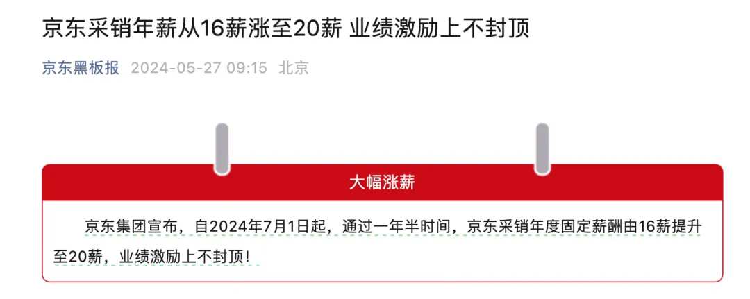 今日,京东集团宣布自2024年7月1日起,通过一年半时间,京东采销年度固定薪酬由16薪提升至20薪,业绩激励上不封顶。