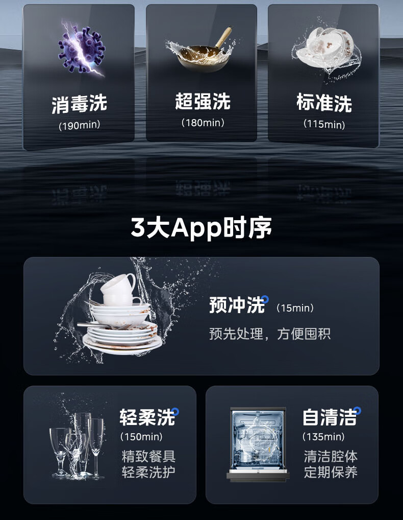 72℃高温煮洗、105℃热风烘干、双压强劲冲、可升降碗篮、6+3+3 丰富时序,符合一级水效。