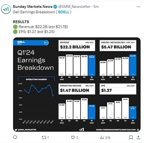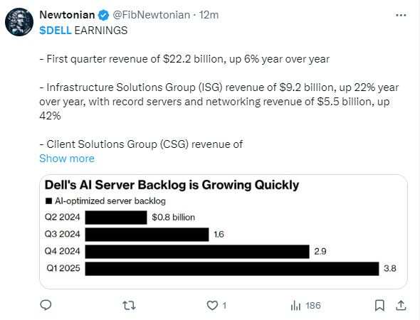 尽管戴尔总营收和分项业务收入都超预期,AI服务器的积压订单高达38亿美元或季环比增长30%,但未能打动对AI寄予厚望的投资者,而且调整后EPS盈利下滑,盘后股价深跌近18%。