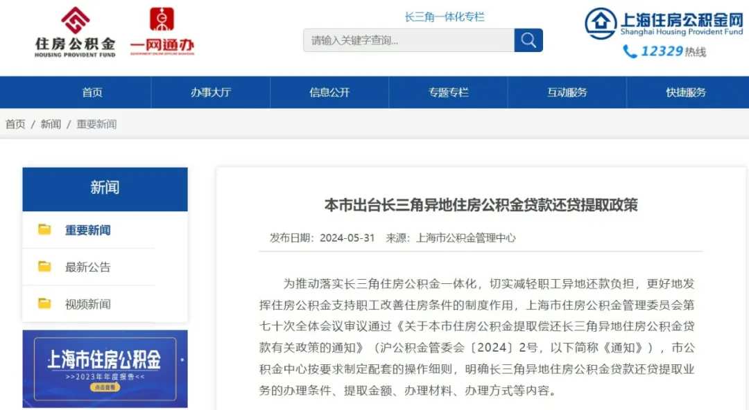5月31日,据“上海公积金发布”,自2024年6月1日起,职工符合以下条件的,可以申请提取本市住房公积金账户余额用于偿还在江苏省、浙江省或安徽省购房的住房公积金贷款。