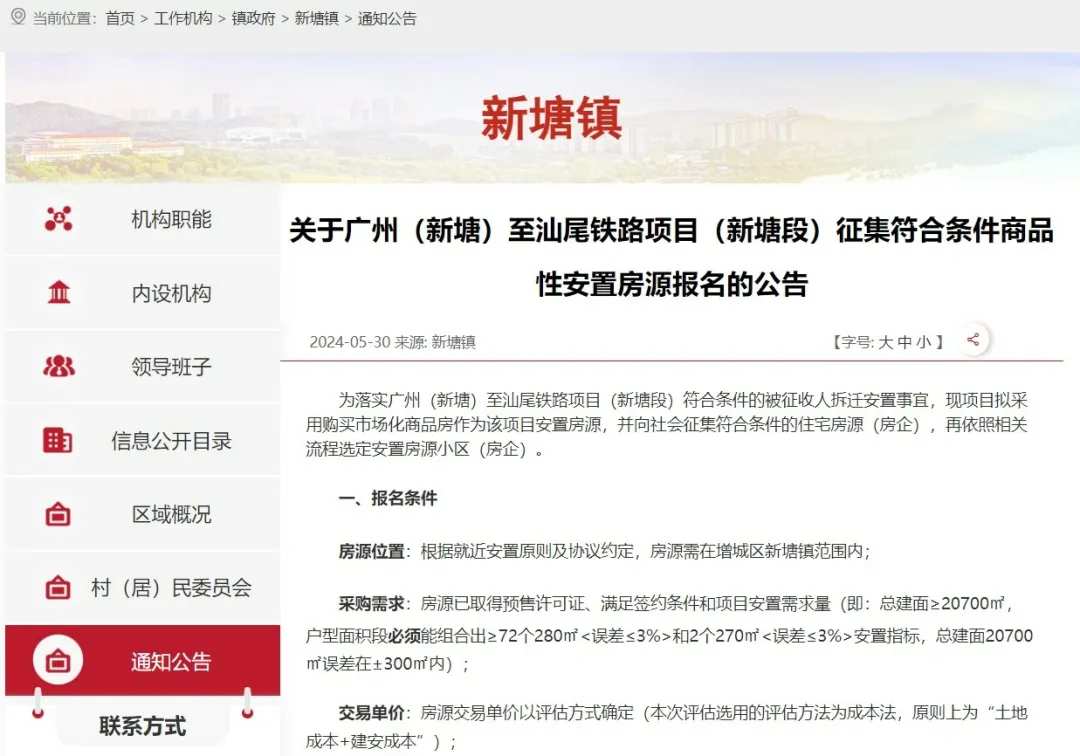 近日,广州增城区政府拟采购一批商品性安置房源的消息引发各界关注。据增城区政府官网显示,为落实广州(新塘)至汕尾铁路项目(新塘段)符合条件的被征收人拆迁安置事宜,项目拟采用购买市场化商品房作为该项目安置房源,并向社会征集符合条件的住宅房源(房企),再依照相关流程选定安置房源小区(房企)。