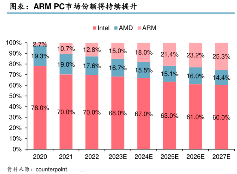 大摩此前预计到2027年,WoA(Windows on ARM) PC芯片销量将达到5000万颗,带来100亿美元的PC CPU收入。