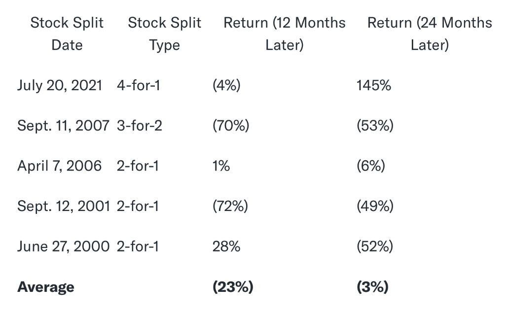 进一步拉长周期来看,尽管股价最初下跌,如果投资者在拆股时购买股票,往往获得很好的回报。