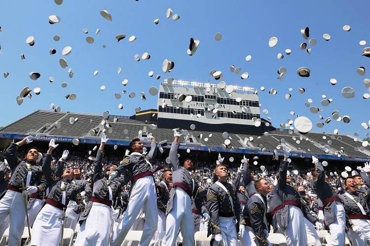 美国西点军校毕业典礼,新一届毕业生们将帽子抛向空中庆祝,纽约。2022年西点军校共有1014名毕业生并全部获得陆军少尉军衔。5月20日,美军参谋长联席会议主席 Mark A. Milley 出席西点毕业典礼并发表演讲,他警告称世界爆发大国冲突的风险正在提高,美国不再是无可匹敌的全球霸权,美军在太空、网络、海洋、空域、陆地等各个领域都面临挑战。他强调未来是机器人、人工智能等高科技武器的战争。Milley 还指出美国在欧洲受到俄乌冲突的挑战,亚洲受到中国经济和军事增长以及朝鲜核威胁挑战,中东和非洲则受到恐怖主义的挑战。摄影师:Michael M. Santiago