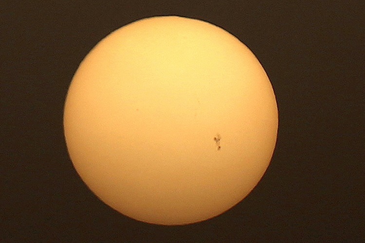 从科威特城拍摄的太阳照片,右侧斑点为太阳黑子「AR3014」。这是2019年太阳进入第25周期迄今最大的太阳黑子现象,宽度达到12.5万公里,相当于地球直径的10倍。NASA 观测数据显示「AR3014」面积在5月21日达到历史最大值,5月22日开始缩小,目前相当于5个地球的尺寸。摄影师:NASA
