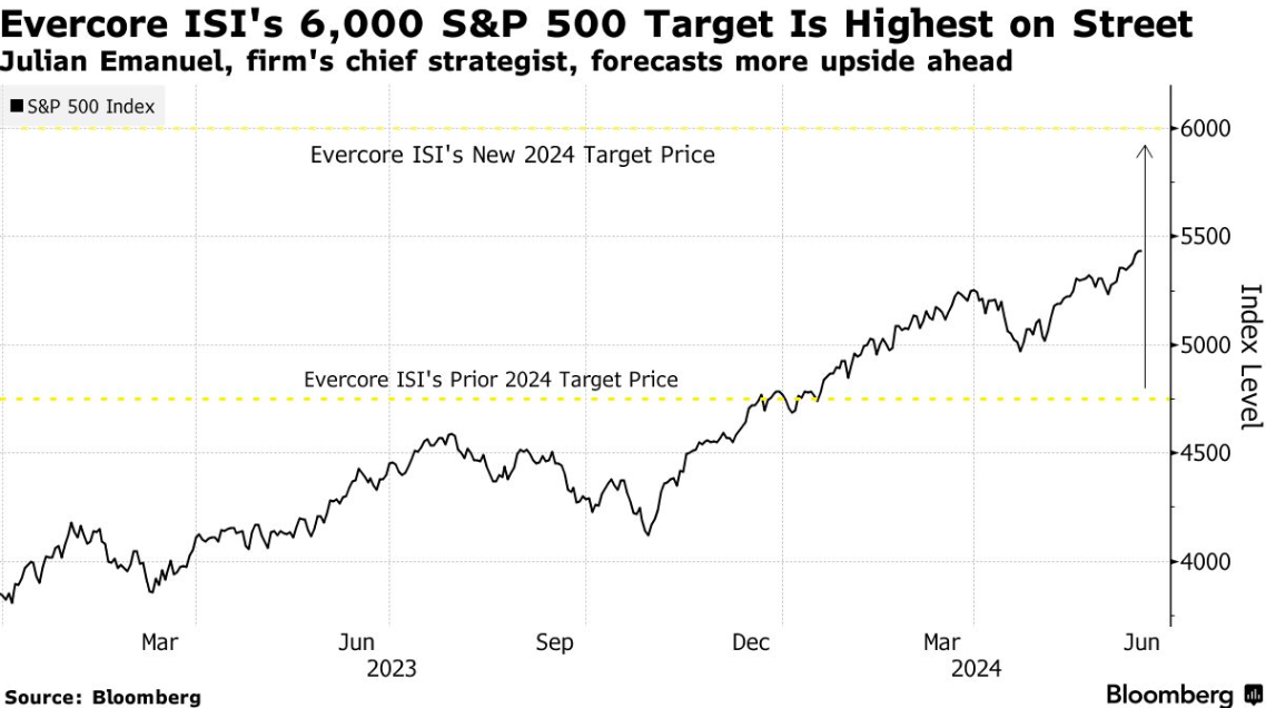 随着$标普500指数 (.SPX.US)$创下一个又一个纪录,Evercore ISI预测,到2024年底,该指数将再次出现两位数的涨幅。