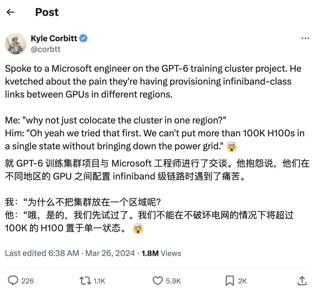 为了训练GPT-6,微软与OpenAI曾搭建了一个由10万张H100组成的服务器集群,测试了一下发现当地电网直接罢工。