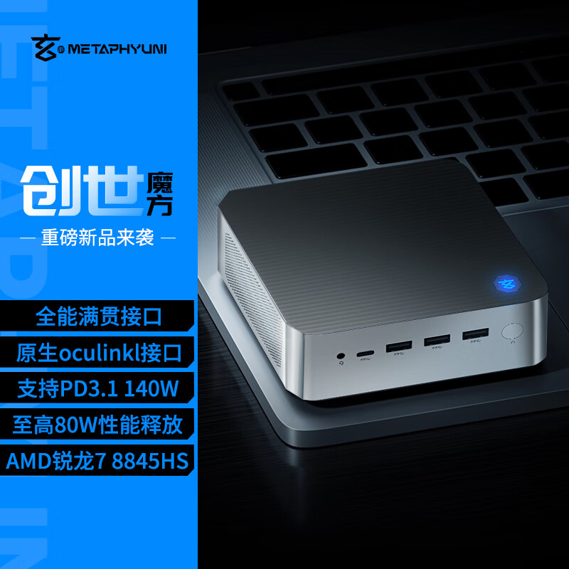 性能方面,该迷你主机搭载锐龙 7 7840HS / 8845HS 处理器,提供准系统与 16GB + 1TB 配置可选,采用“玄冰散热系统”,内置独立散热风扇 / 铜制散热鳍片,最高性能释放达 80W。