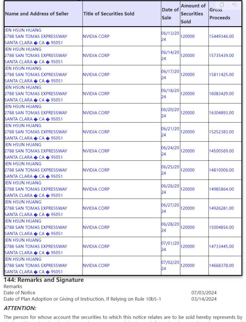 英伟达最新提交给SEC的监管文件显示,6月13日至7月2日,黄仁勋合计出售了156万股英伟达股票,套现约1.98亿美元。