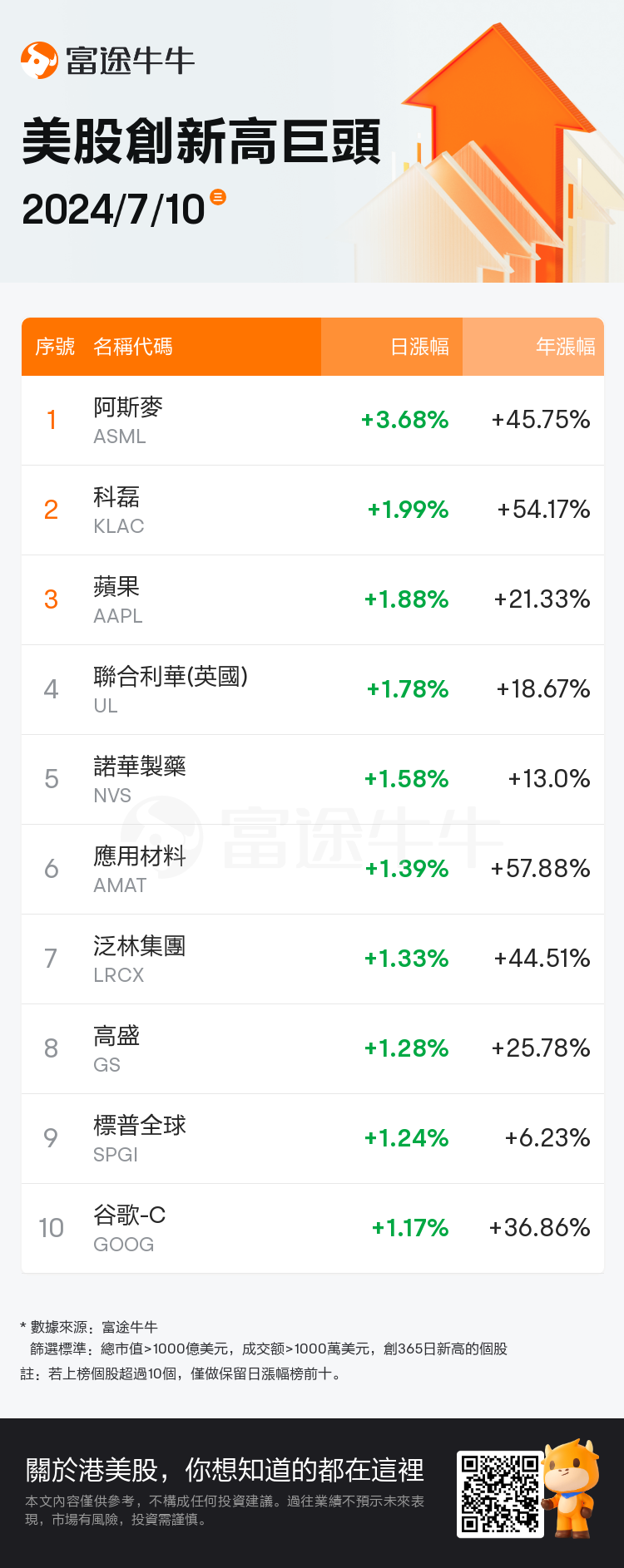 1、投行上调目标价,半导体设备股纷纷走高!阿斯麦 (ASML.US)涨近4%、科磊 (KLAC.US)涨近2%、泛林集团 (LRCX.US)涨超1%,应用材料 (AMAT.US)涨超1%,均续创年内新高!