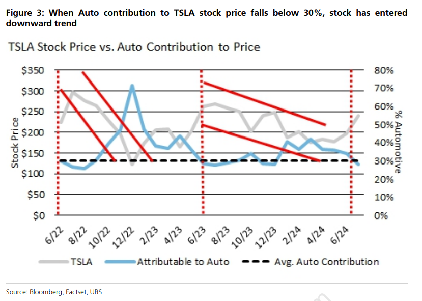 然而,瑞银指出,投资者对特斯拉新业务、非核心业务和增长计划给予的溢价因人工智能热情而扩大,一旦这种热情减弱,可能会影响股票的估值。