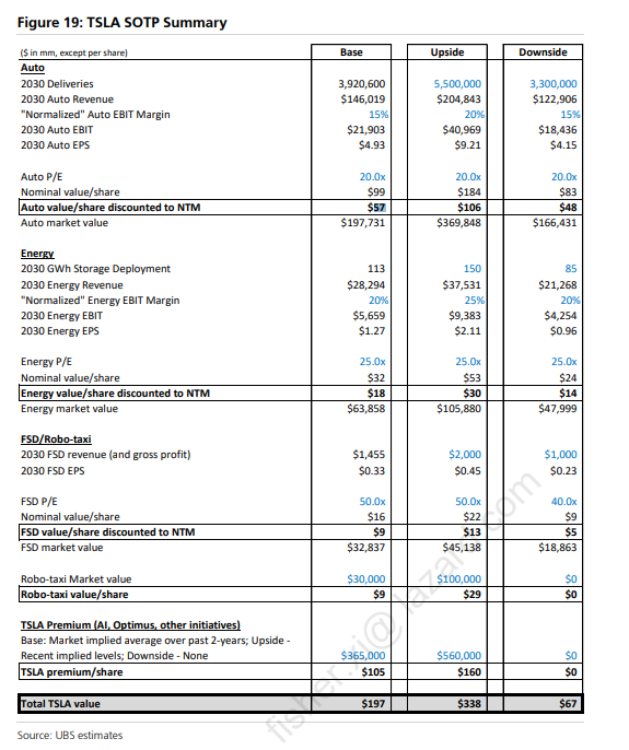 根据瑞银的估算,特斯拉的汽车业务价值约为每股57美元(约占目前目标价的28.9%),近期增长强劲且利润率更高的能源业务价值约为每股18美元,全自动驾驶/机器人出租车业务可能价值约每股18美元。