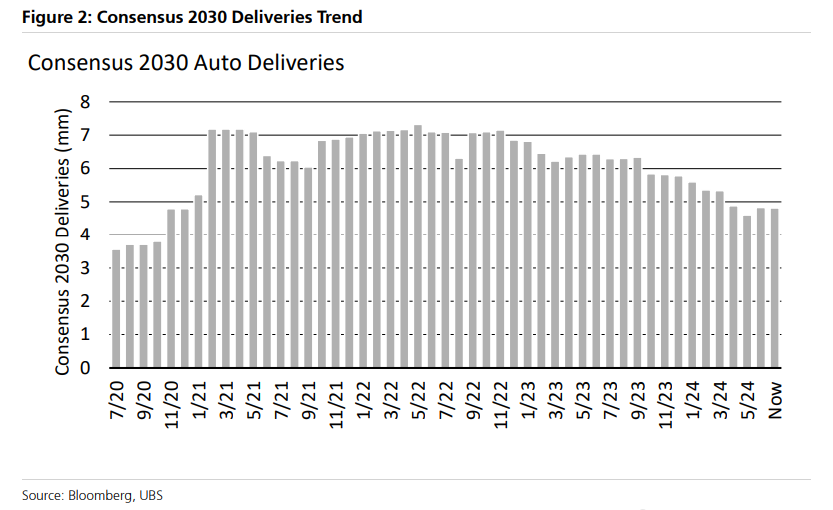 展望未来五年,瑞银对特斯拉在2030年的汽车交付量持保守态度,预计交付量将达到约390万辆,这一数字较市场普遍预期低19%。