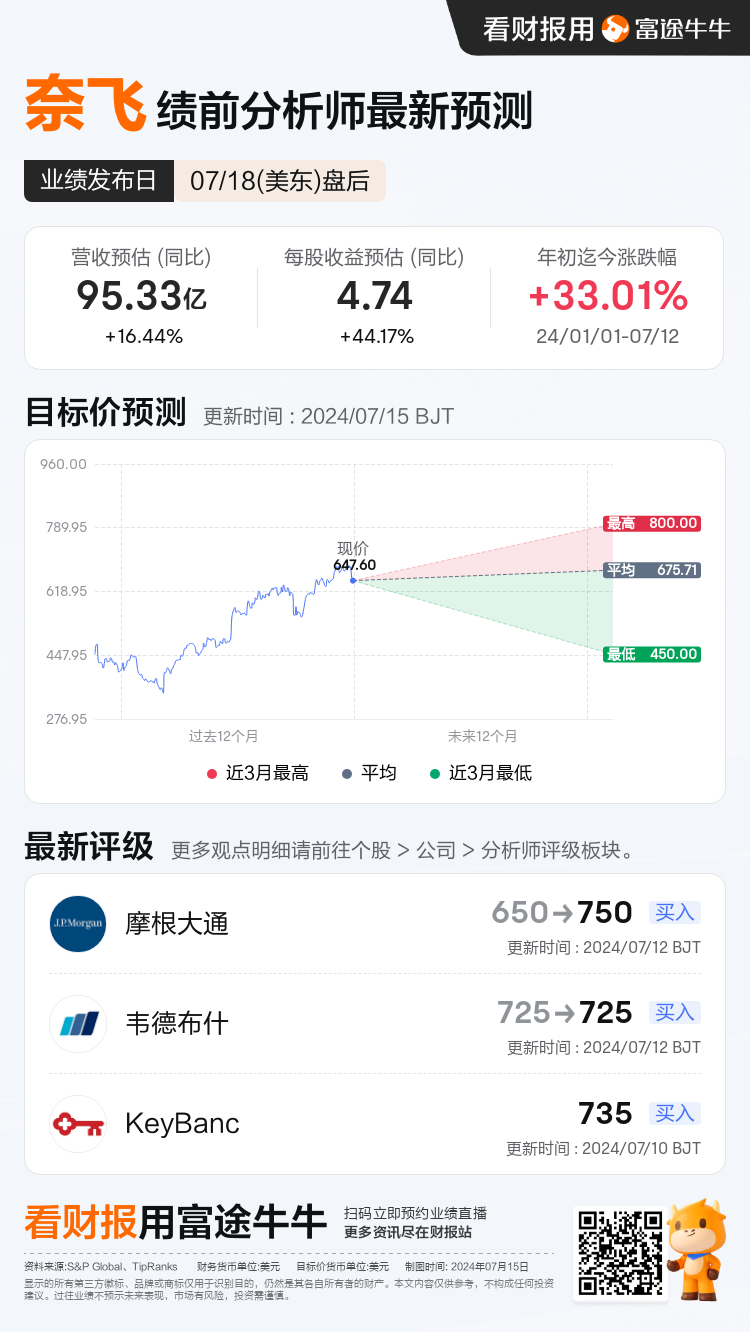 对于即将公布的二季度财报,市场普遍预测,奈飞预计实现营收95.33亿美元,同比增长16.44%;每股收益为4.74美元,同比增长44.17%。近期共有33位分析师对该股做出评级,平均目标价为675.71美元。