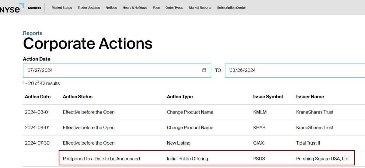 美东时间7月26日周五,纽交所官方网站显示,Ackman创立的潘兴广场资本管理公司(Pershing Square Capital Management)推迟了旗下封闭式基金Pershing Square USA (PSUS.US)的IPO,网站未披露该基金将推迟到何时再公开上市。
