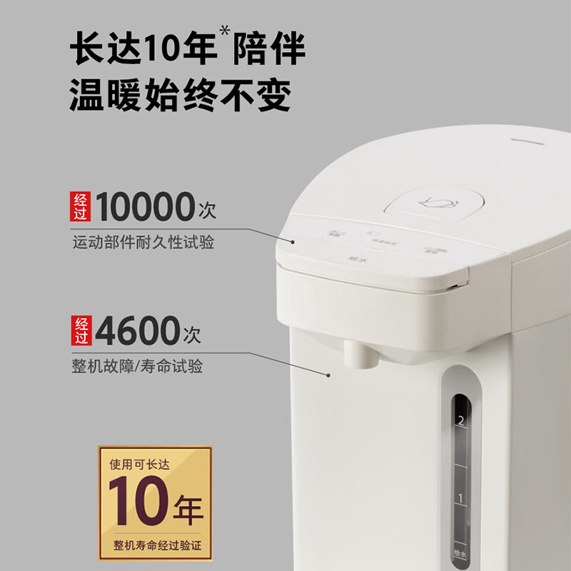 产品配备进口 NTC 温控器,可精准感温沸腾,一键延长沸腾时间,减少余氯产生。下沉式排水阀可避免与陈水混煮,避免千滚水与阴阳水。此外,该产品还支持 45℃、70℃、80℃、90℃保温设定,官方宣称 15 分钟烧开 2.5L 水。