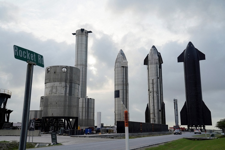 SpaceX 星舰原型机和一枚重型火箭矗立在发射场,美国得克萨斯州。星舰原型机迄今共完成5次高空试飞,高度达到10公里,预计最快于6月进行首次近地轨道试飞,目前正在等待美国联邦航空管理局(FAA)审批发射许可。星舰飞船未来将成为空间站任务、载人登月和火星登陆的主要载具。SpaceX 计划在2030年前实现载人登陆火星,并目标将每吨有效载荷的单位发射成本降至10万美元以下。摄影师:Veronica G. Cardenas