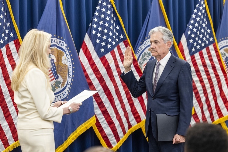 美联储主席 Jerome Powell 连任宣誓就职,华盛顿。5月23日,美联储主席 Powell 正式开启第2个任期,新任期将持续至2026年5月。他在媒体采访中表示将不惜一切代价降低通货膨胀率,并承认「如果提前预知通胀上升速度,美联储会更早改变货币政策」。市场预测美联储将在6月中旬再次大幅提高基准利率50个基点,预计2022年底达到2.75%-3%区间。2022年4月美国消费者价格指数(CPI)同比上涨8.3%,继续维持40年高位。摄影师:Jim Lo Scalzo