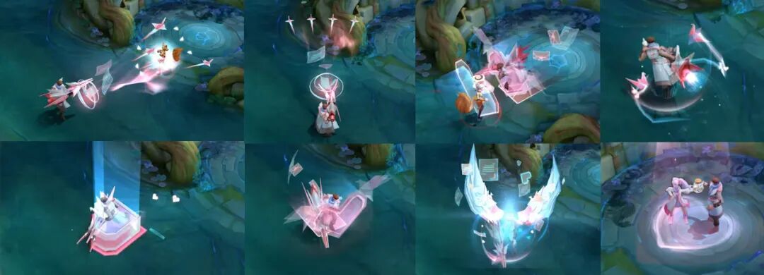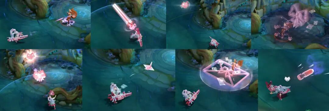 整体特效是粉色的,把原来的星光元素基本都换成了 千纸鹤 。普攻会发射出 3道粉色的 千纸鹤 ,命中敌人之后千纸鹤会受到撞击在空中 盘旋打转 ,而后 变淡消失 。