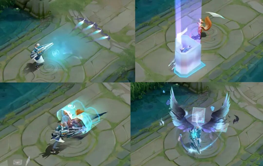 普攻是释放出几道 蓝紫色的乌鸦 ,一技能则是一个蓝色的爱心从天而降,二技能冲刺时同样会出现蓝色爱心。大招的蓝色翅膀挺好看的。