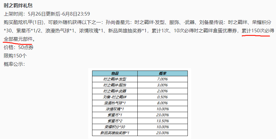 重点来了 :根据官方的说法, 抽满150次必定出【全部星元部件】 ,这里只有孙尚香的星元是 “星元部件” ,刘备的 星传说是“皮肤” 。因此 即便你抽满了150次,他只给你保底拿到孙尚香的全部部件;你依旧有可能拿不到刘备的星传说皮肤。 而且150次之后礼包就下架了,你就买不了了。