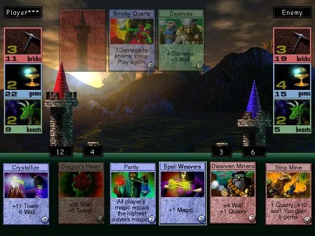 这个游戏还有一个特色,或许也是 RPG 历史上最好的小游戏。在《巫师 3(Witcher 3)》的昆特牌(Gwent)出现之前还有个名叫魔幻牌(Arcomage)的小游戏。魔幻牌毫无疑问是一个更有深度、更平衡的集换式卡牌游戏,时至今日还有线上的多人游戏大厅。