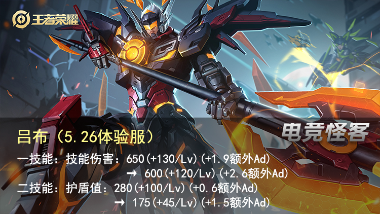 吕布在前几天的调整中获得了加强,一技能的伤害和二技能的护盾值的AD加成都更高了。这一次5.26日的调整算是对之前调整的一个回调, 主要回调了二技能的基础护盾值,和等级护盾加成。