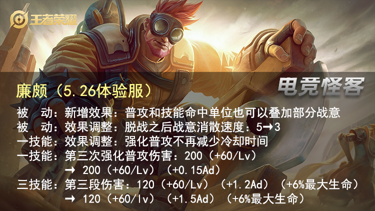 但总的来说, 个人认为还是能看做一次偏加强向的改动 ,毕竟更高的战意值能提升廉颇的坦度,而廉颇也并不主要是靠一技能来打伤害,移除普攻减CD机制,也就影响一些廉颇的机动性。