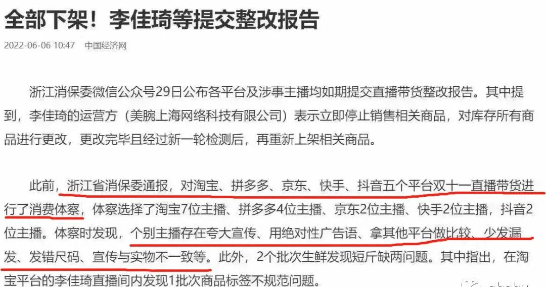 李佳琦自3号以后就停止了直播卖货,连事先预告的也没有如期开播,随后中国经济网就发布了文章中提到:浙江省消保委通报,对五个直播卖货平台的部分双十一主播带货进行了消费体察,过程中发现有主播存在夸大宣传、少发漏发等问题,要求他们进行整改。