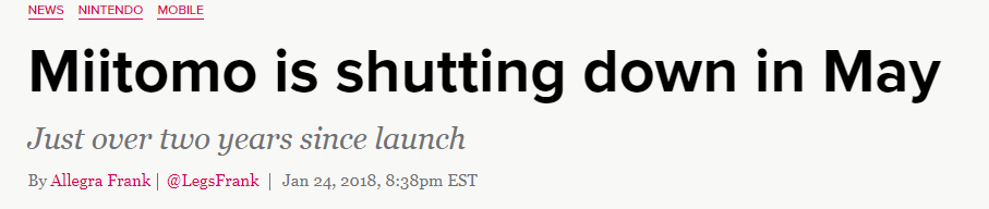 可《 Miitomo 》在上线几个月后用户就开始大量流失,并且在 2 年后的 2018 年就宣布停服了。