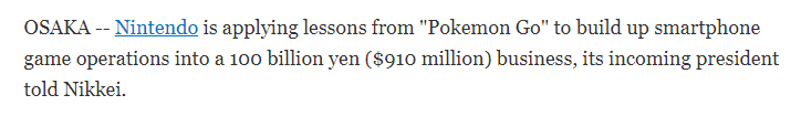 他在 2016 年年底表示任天堂已经把手游业务视为 “ 第三根支柱 ”,并计划在将来每年推出 2-3 款手游。