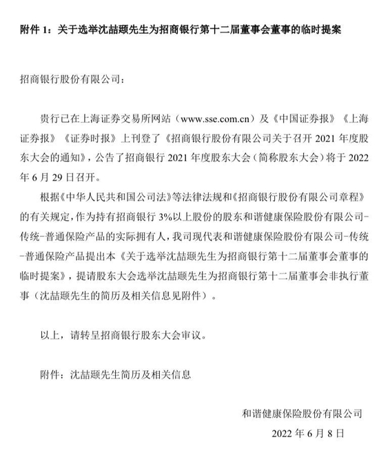 该提案来自招行的第七大股东和谐健康保险股份有限公司(下称“和谐健康险”)。其在提案中声称,作为持有招行3%以上股份的股东,其在6月8日向招行董事会提交了《关于选举沈喆颋先生为招商银行第十二届董事会董事的临时提案》,提请股东大会选举沈喆颋为第12届董事会非执行董事。