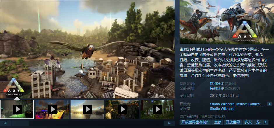 《方舟:生存进化》(ARK: Survival Evolved)是一款多人在线生存竞技网游,由虚幻4引擎打造。
