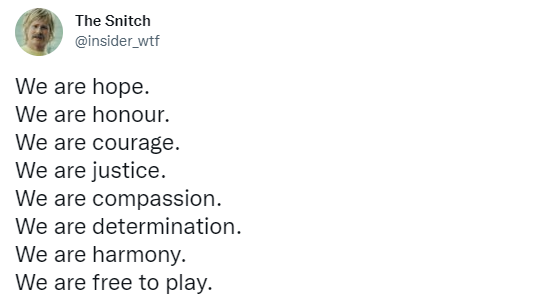 The Snitch将原视频中的最后一句“We are Overwatch(我们是守望先锋)”改为了“We are free to play(我们免费玩了)”。