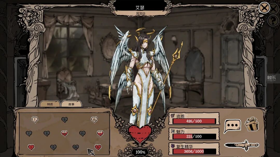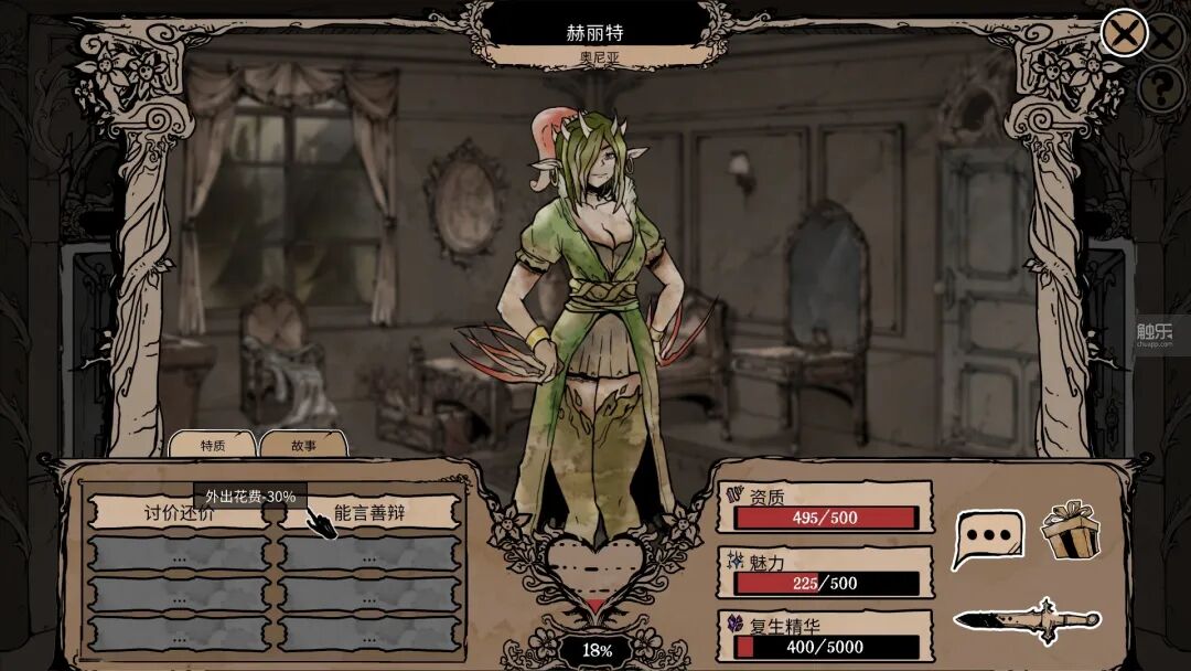 特性还分为正面和负面两大类,有些正面特性确实很逆天,也能一定程度上影响玩家是否将这个魅魔献祭的决定——是的,谈到献祭,前作中玩家选择不多,“工具人”属性好坏其实不怎么影响献祭的决定,影响决定的是个人好恶,比如你喜欢植物系的可能就留着不杀。本作中用特性来区分魅魔,特性上佳的拥有打工全套Buff,一人养全家,那可怎么忍心献祭呢?而特性差,比如出门花销大、不好好学习的,似乎就没有留她活着的必要……