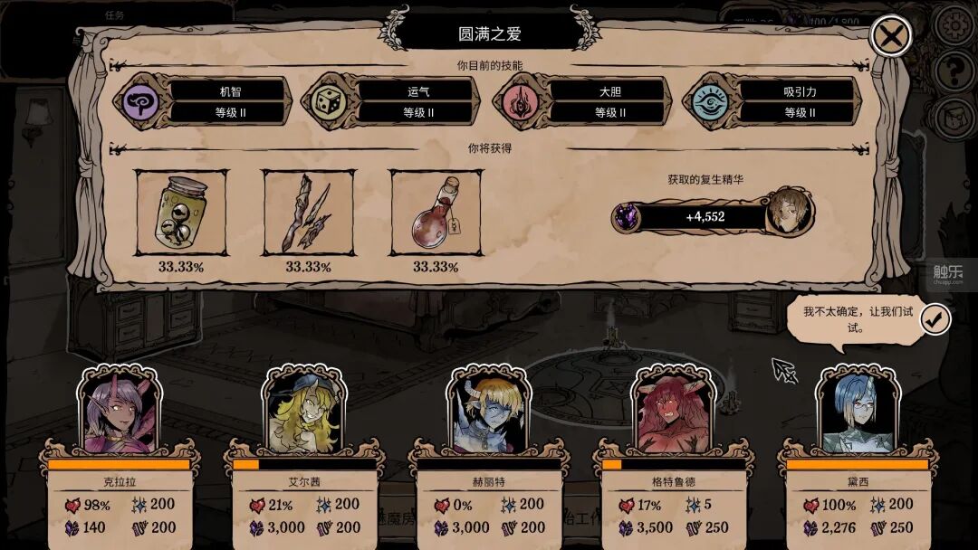 玩法上的另一点进化是给主角也安排了个技能树,成长经验值也是游戏最终目标追寻的“复生精华”。主角级别提高后不仅可以触发更多剧情,而且在各方面都有正反馈,比如大幅提升新召唤魅魔的初始能力等。这让玩家在养成玩法中有更多考虑和抉择,而非前作那样重复机械操作。