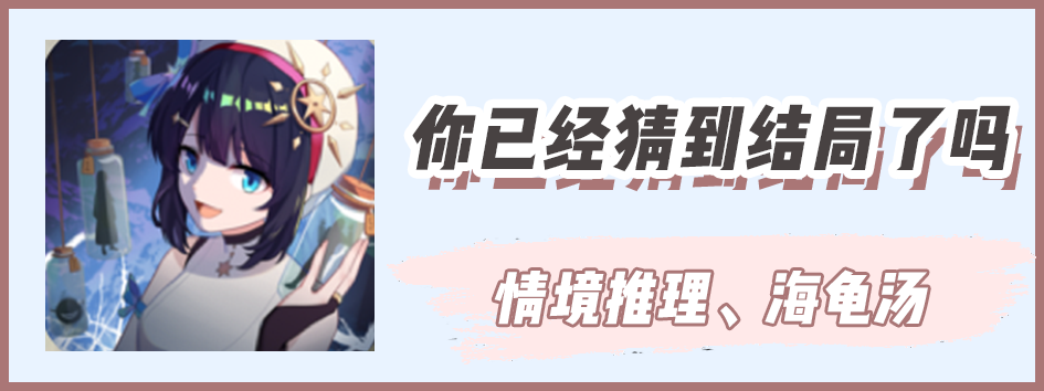 喜欢推理游戏的鸡仔可以看看这个“单人海龟汤”,它类似于 微型剧本杀 ,通过对故事重要信息提问,系统会回答 是、不是、没有关联 ,有时也会出现线索补充,由此来 还原事件。